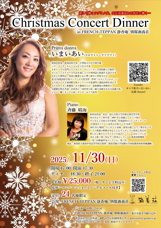■出演/いまいあい(コロラトゥーラソプラノ) ピアノ:斉藤晴海 (コンサート鑑賞、別邸涵養荘フレンチフルコース、乾杯ドリンク付)
