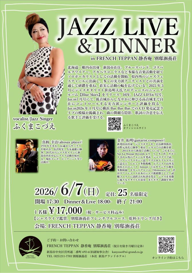 ジャズシンガーふくまこづえさんとバンドメンバーによるライブと別邸涵養荘フレンチフルコースをお楽しみいただけるイベントです。